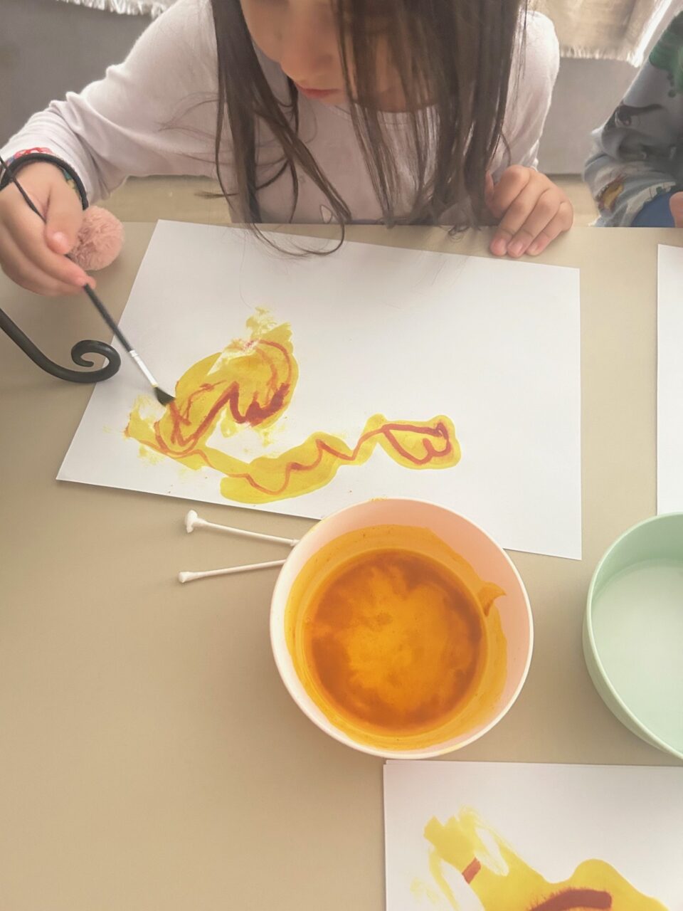 - Βούτηξε μια μπατονέτα ή πινέλο στο διάλυμα κουρκουμά και βάψε όλο το χαρτί, φροντίζοντας να καλύψεις τα μυστικά γράμματα που έγραψες με τη σόδα.